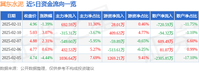 股票行情快报:冀东水泥(000401)2月11日主力资金净买入692.59万元