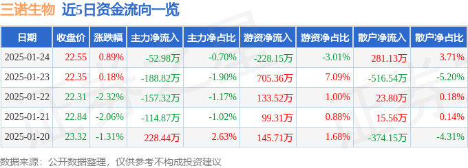 股票行情快报:三诺生物(300298)1月24日主力资金净卖出52.98万元