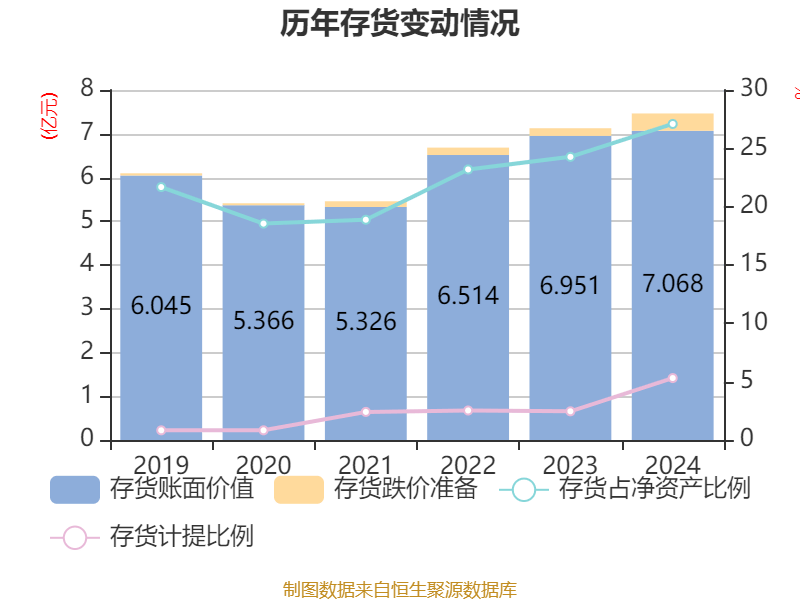 从存货变动来看,截至2024年末,公司存货账面价值为7.07亿元,占净资产的27.09%,较上年末增加1178.51万元。其中,存货跌价准备为3961.78万元,计提比例为5.31%。